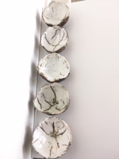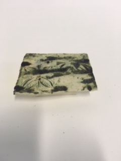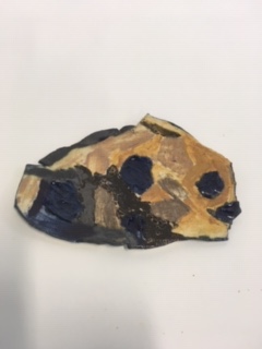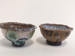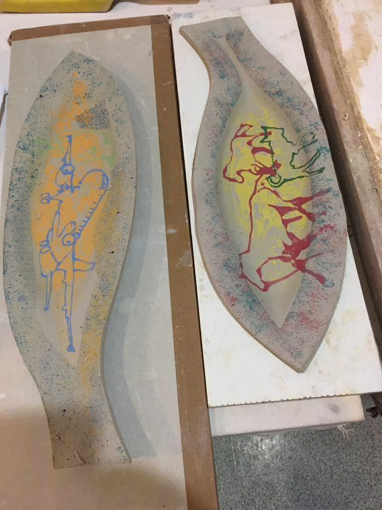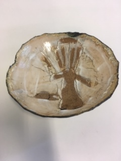 Workshop time spent making slip trail slab pictures in wood frame moulds. Clay rolled and cut to place over wood mould. Slip trail to slab on fish and chip paper or around photo on news paper. Once slip trail shiny turn over and roll on slab. Place slab over wood slab and place on something so it can be dropped from a low height to encourage the clay to drop into frame. Cut excess clay and tidy up edge and place foot or handles as you want. Clean up rims and place to dry for a bisque firing.
