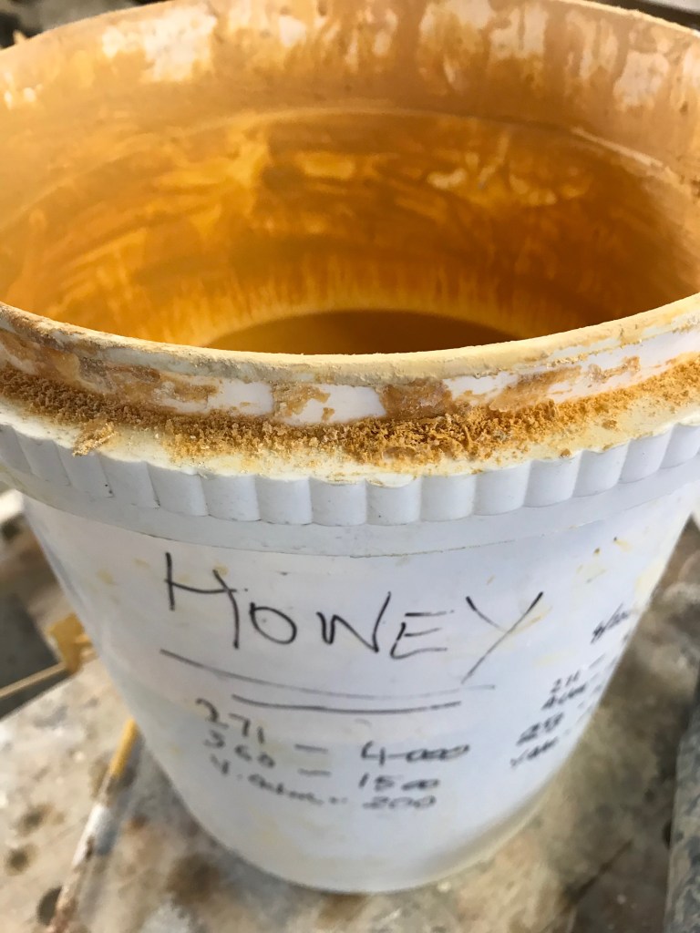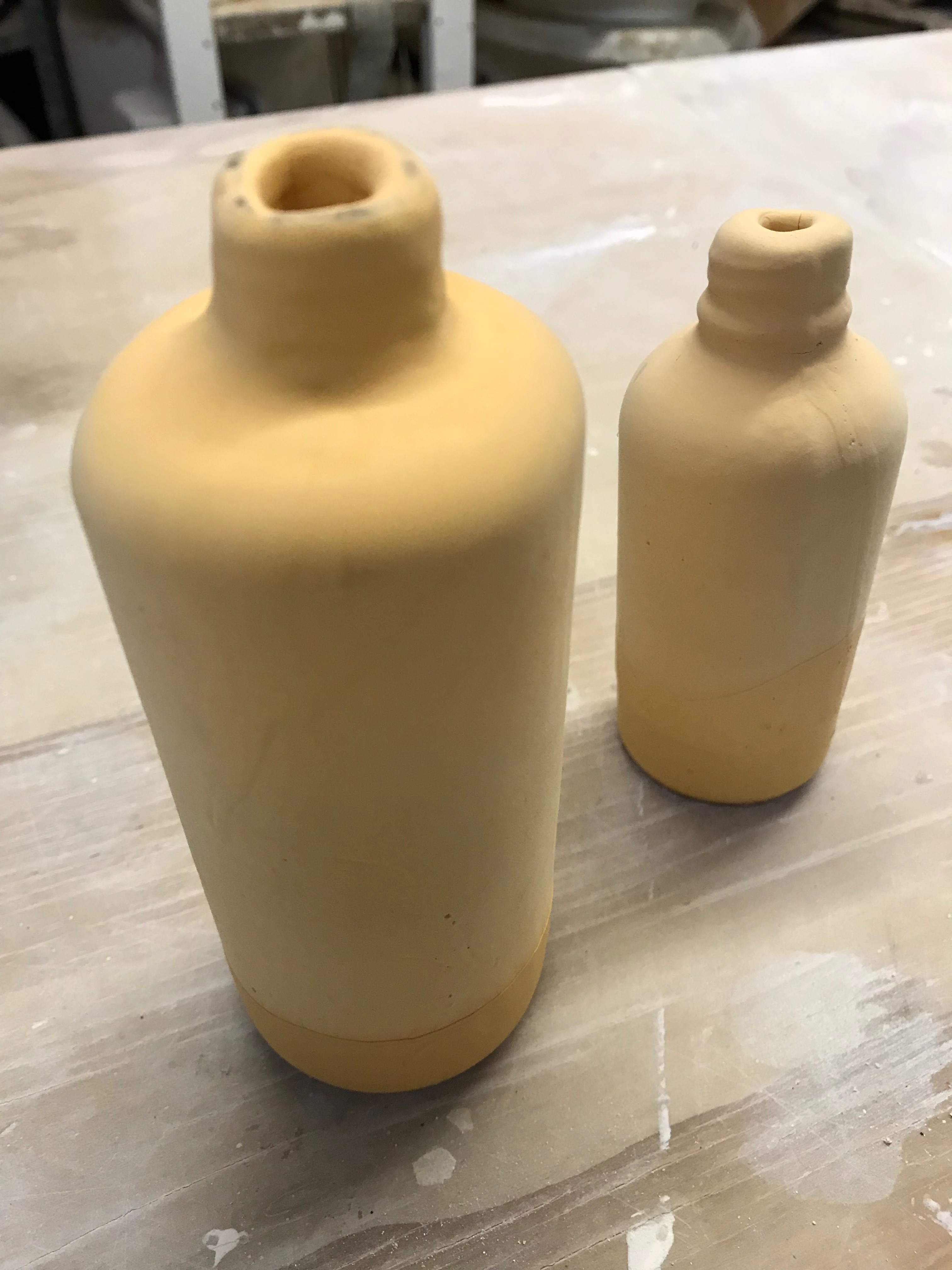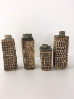 Some bisque ware from this module was glazed with Brendon Adams current glazes. The container was covered in bronze slip and wiped off and the inside had a stable white glaze tipped inside. As you can see a honey glaze was used on the small bottles which I initially tipped on the inside and then used a heat gun so the outside layer of glaze would stick.