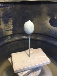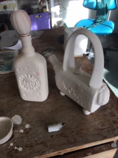 I filled the gin bottle and lemon with a white glaze after applying bronze slip on the outside and wiping off. After tipping it out I used the heat gun to dry the outside so the next outside layers of glaze would stick. I sprayed the glaze on these items and used aramont blue green on the bottle and turquoise glaze on the lemon.