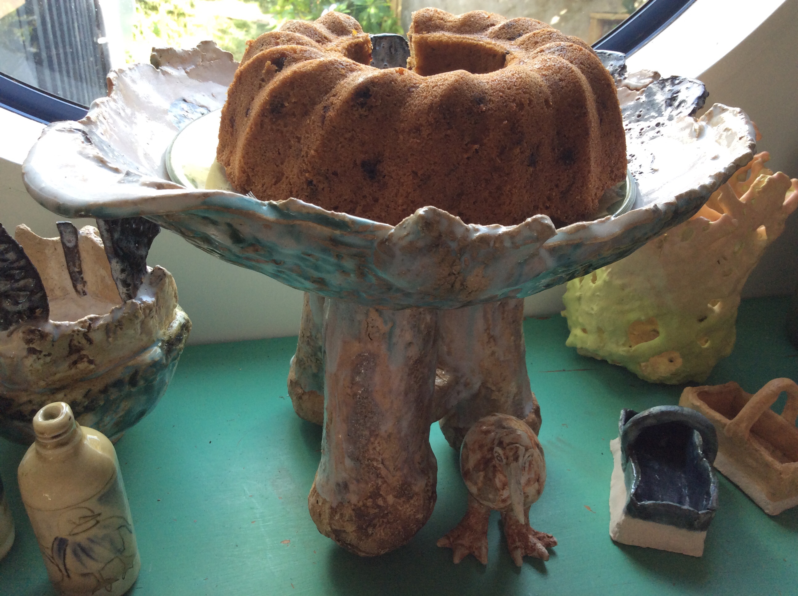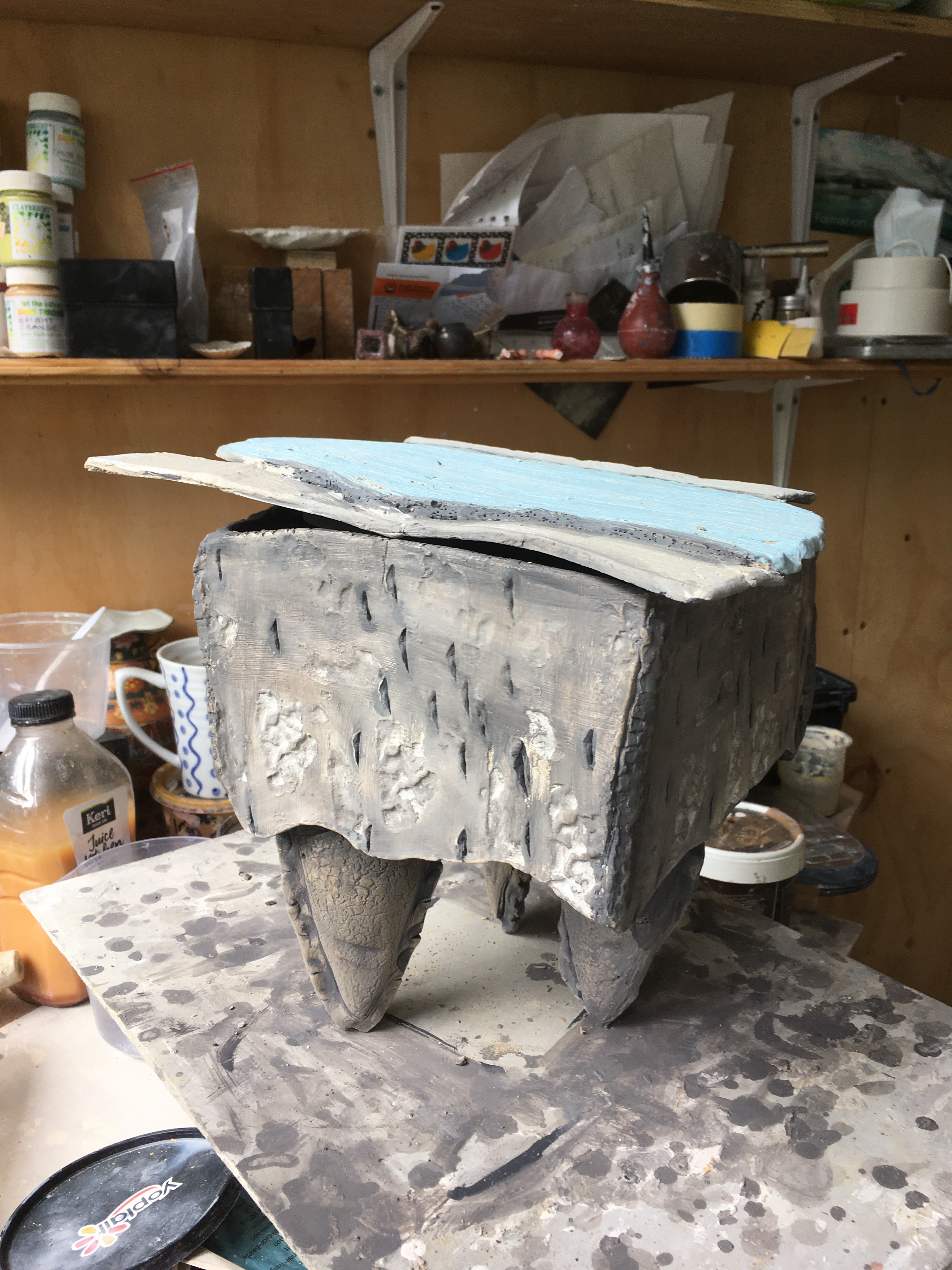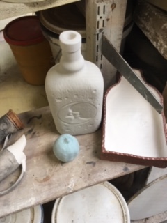 A random teapot was made by using the gin bottle slip ware, half a lemon slip ware and a handle I made using one of Brendon’s moulds with a lid and feet which were some of Brendon’s own slip ware. I needed some extra slip which was tipped onto some plaster to partially dry and then applied to cover the gap made by repositioning the spout.