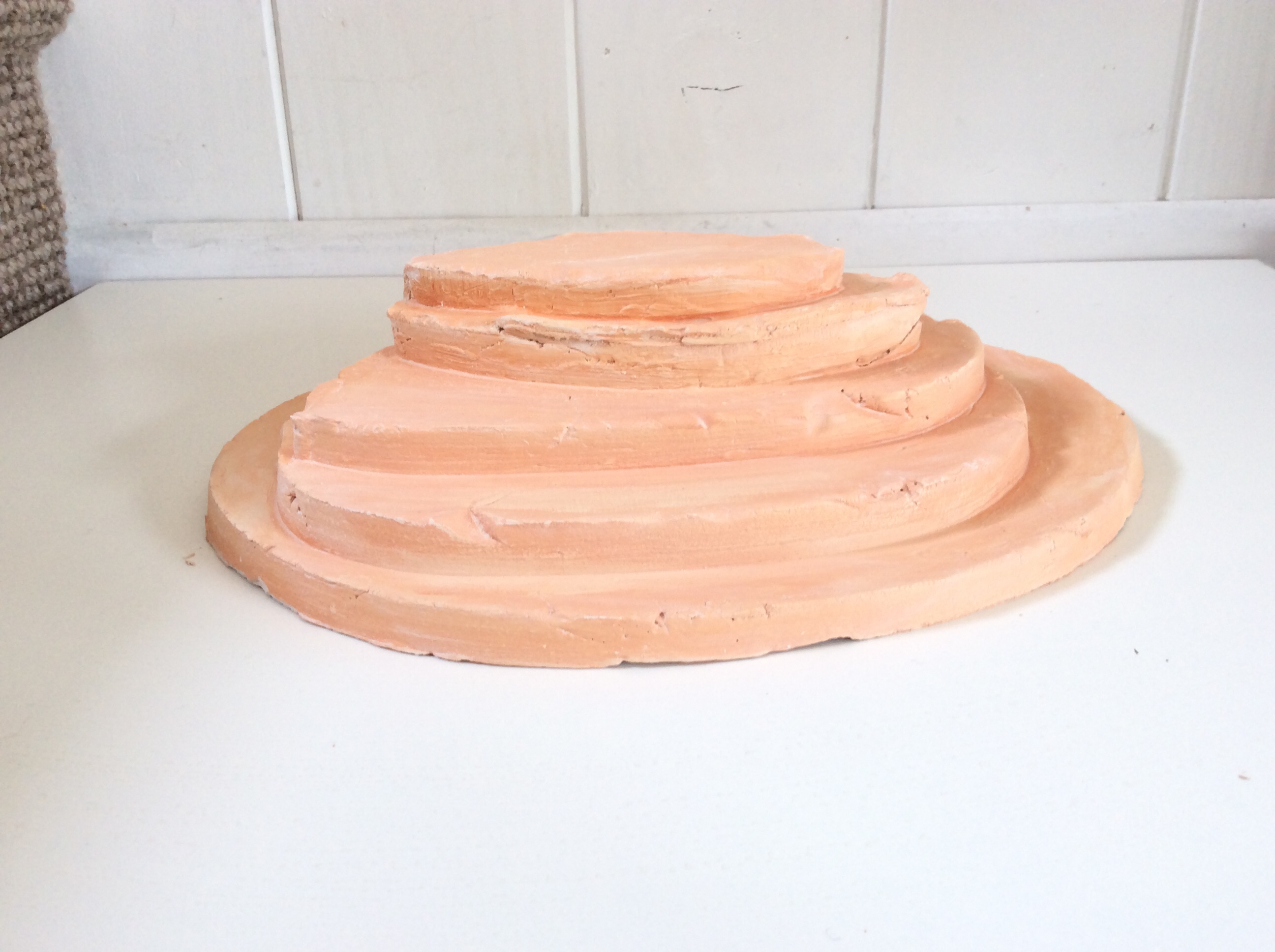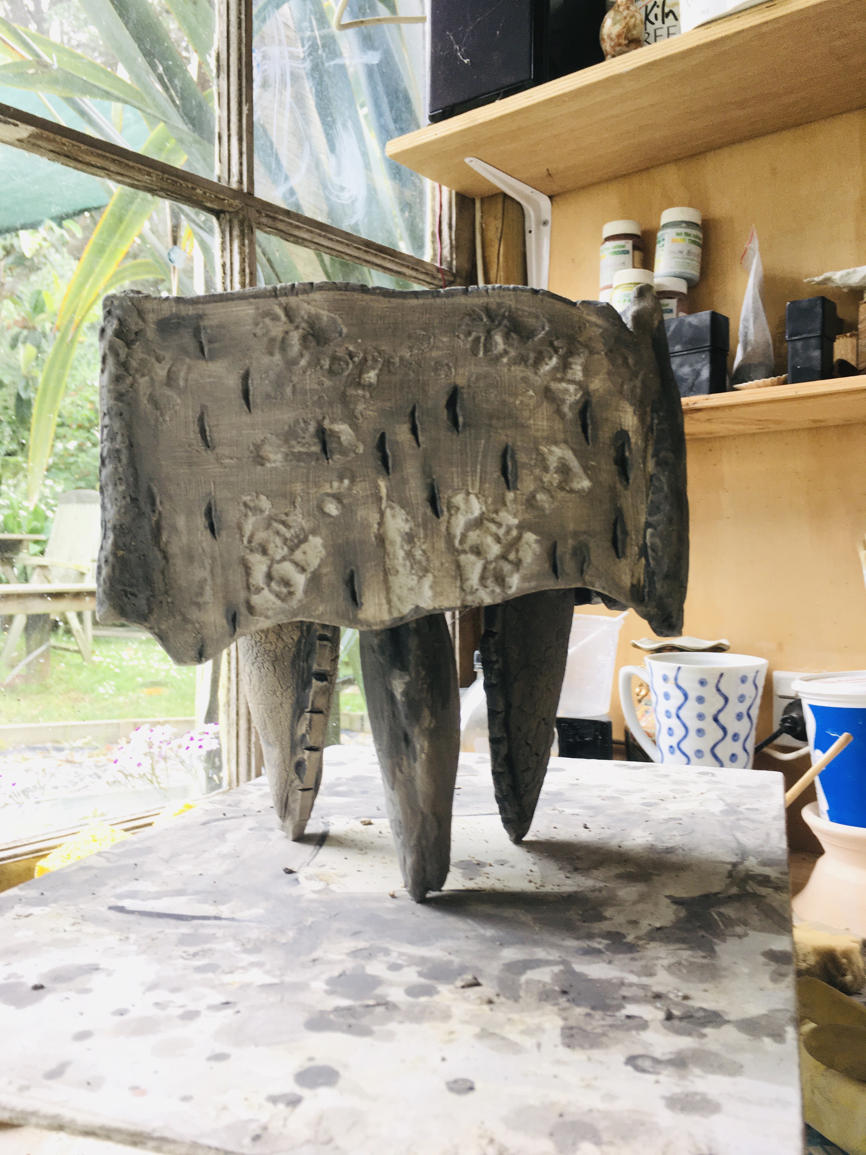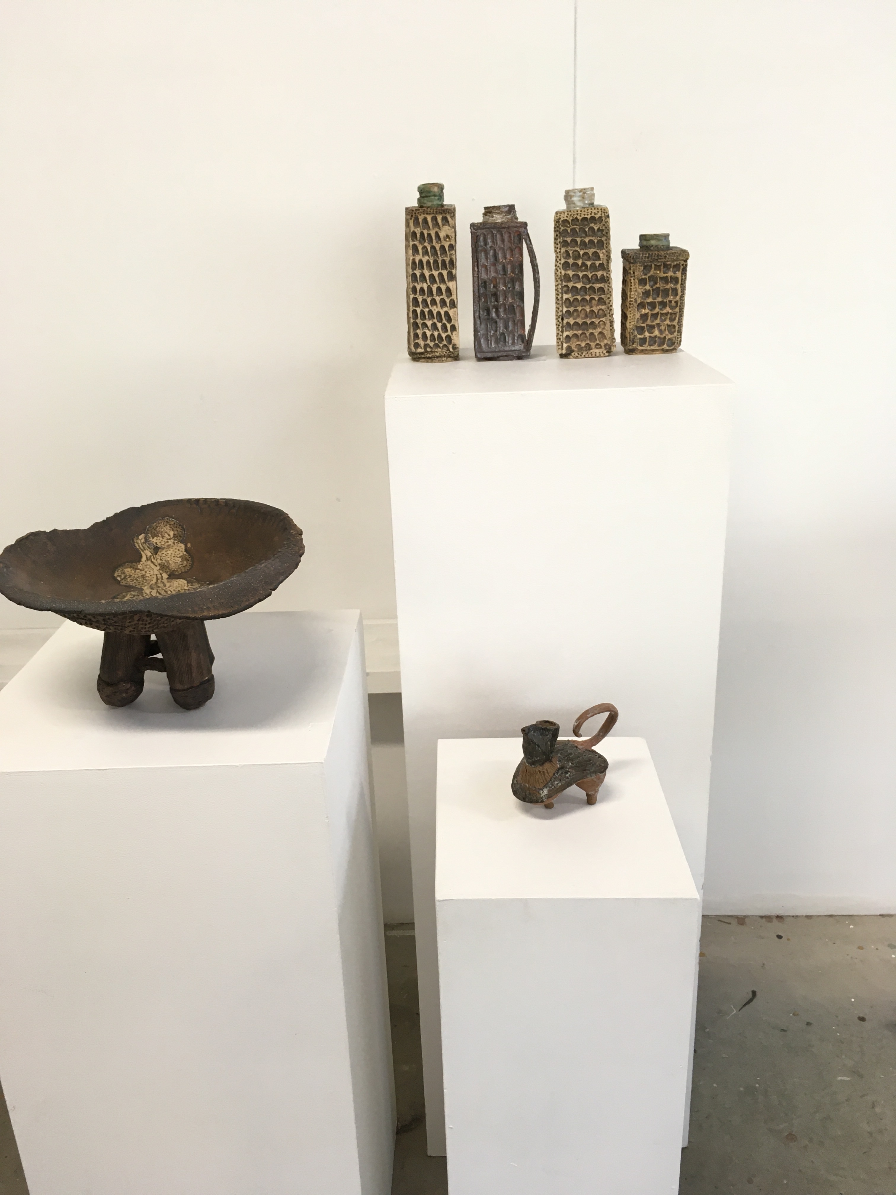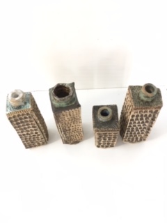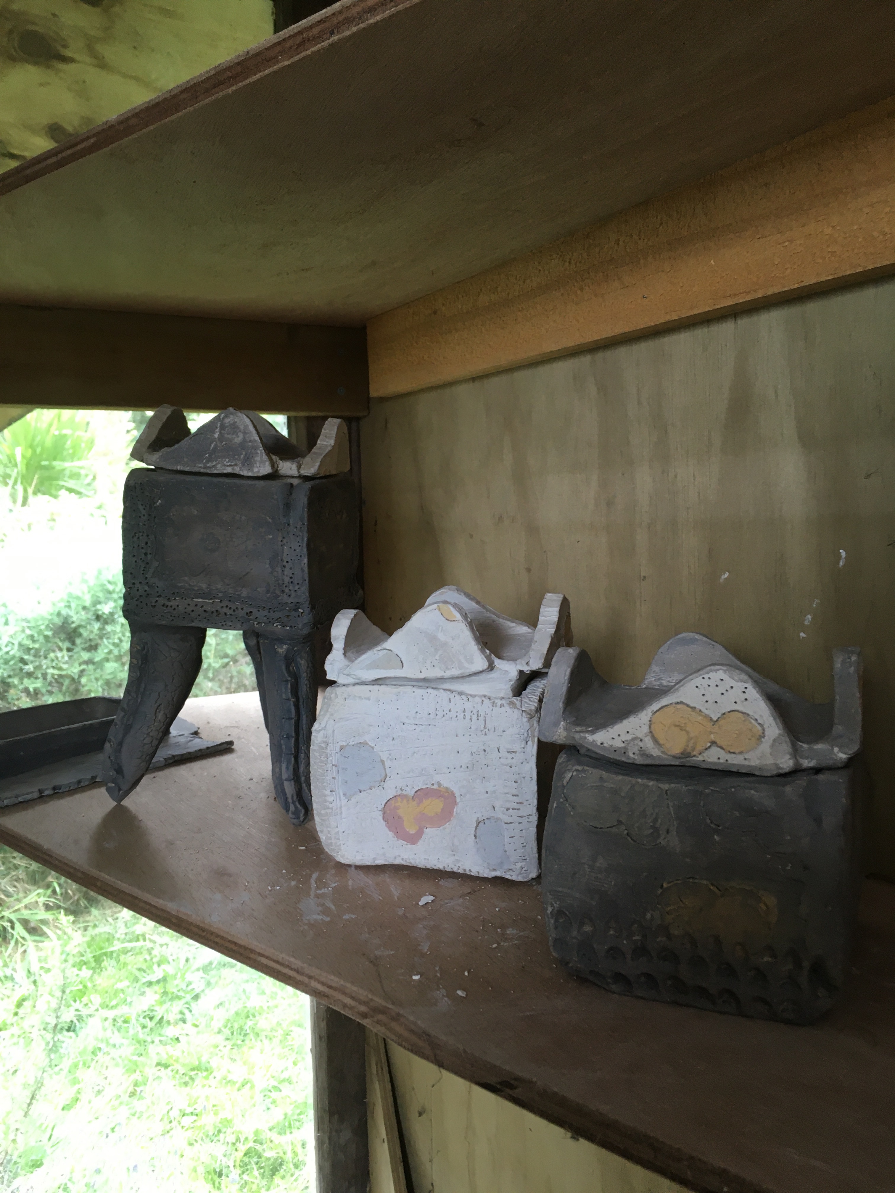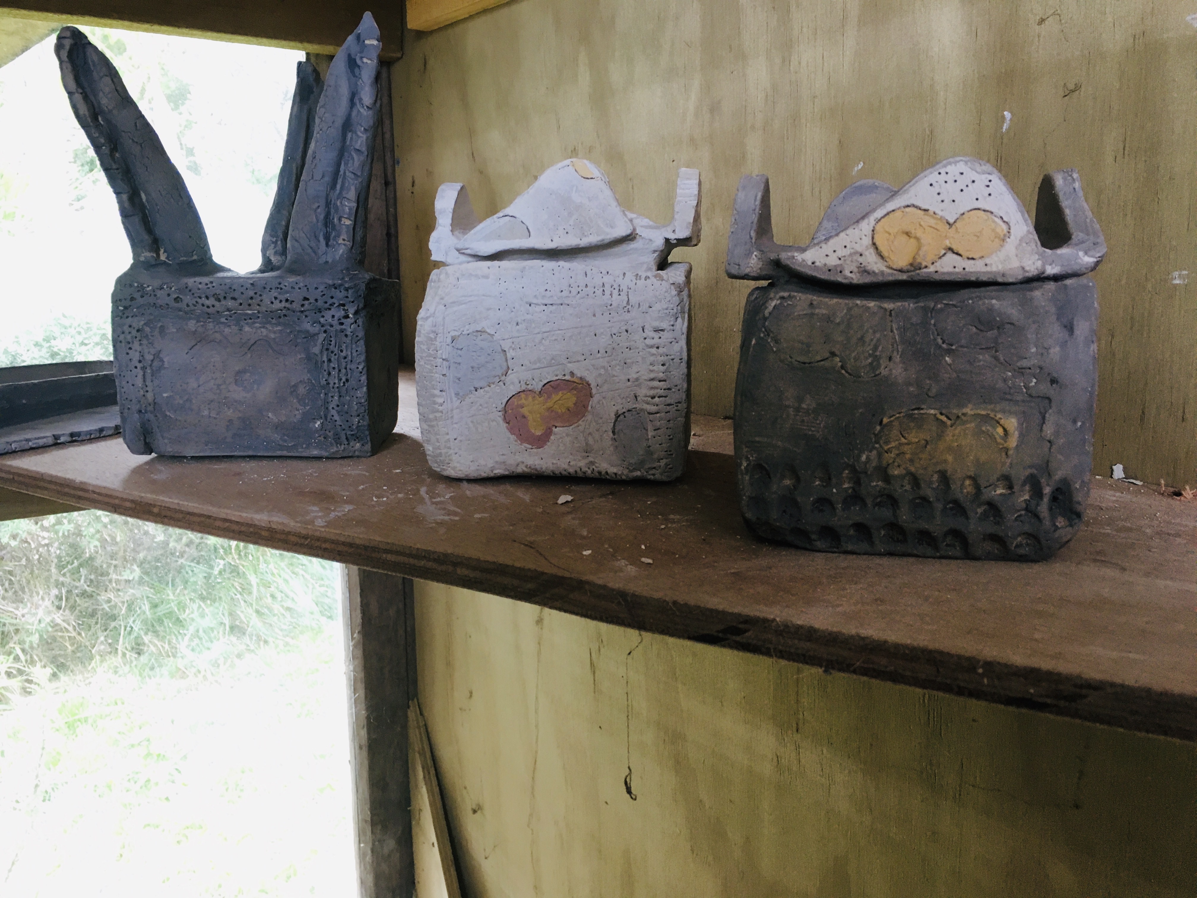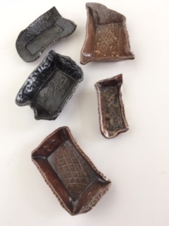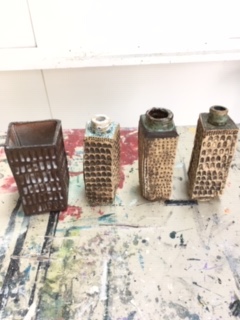 These items apart from the container have been left with Brendon to fire at his work heat temperature which is over 1200 degrees celsius. The container which I slab worked will need to be fired at a lower temperature to keep the terracotta colour.