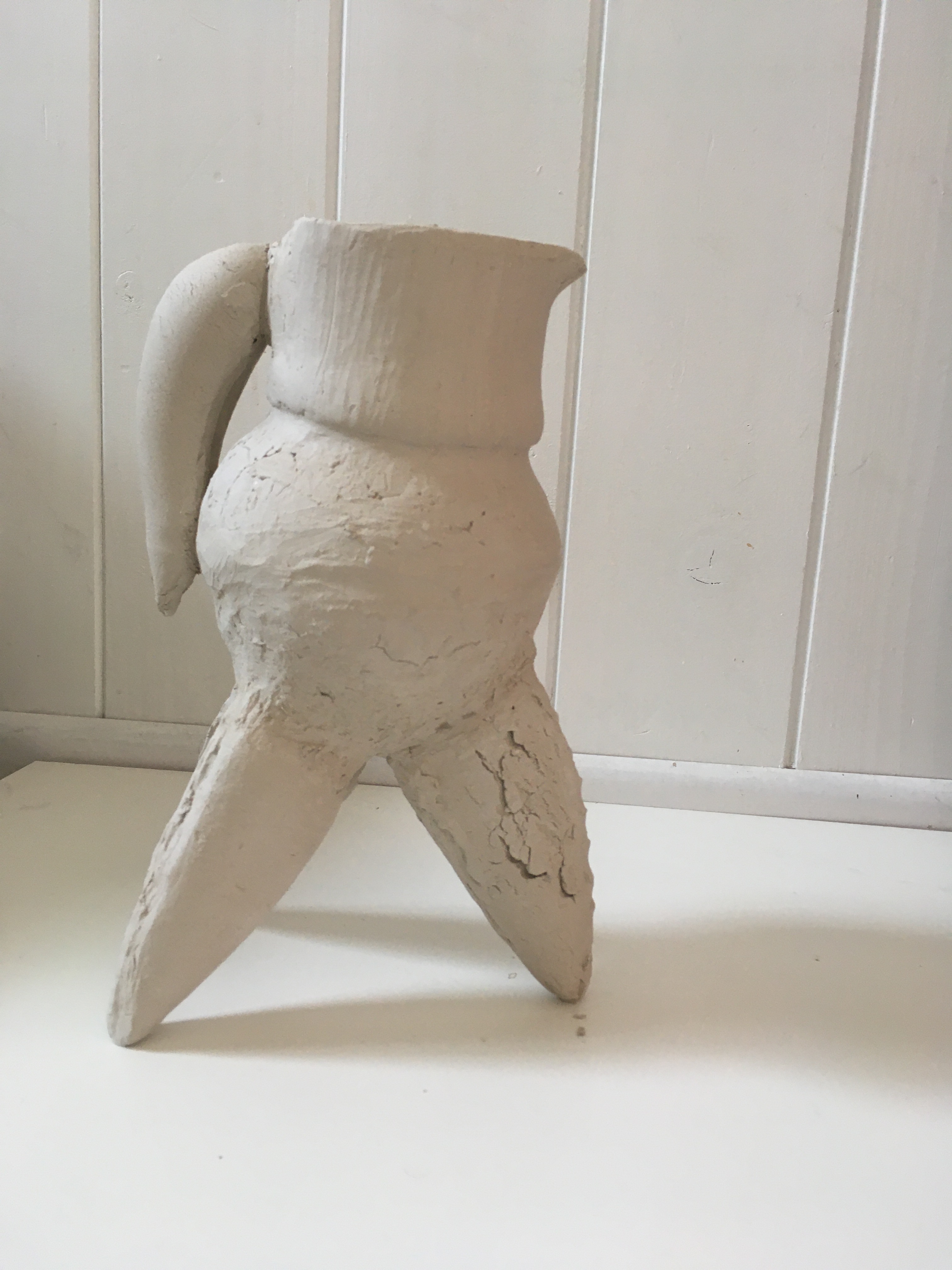The exercise was to experience the joining of slip ware . Vinegar was used for this as if magic water or more sodium was applied the slip ware would melt. A liquifaction moment occured when the holes under the spout were made. The slip just melted so to save the piece some dried plaster was pushed onto this spot to harden it up. I believe a chemical reaction occurs for this to work.