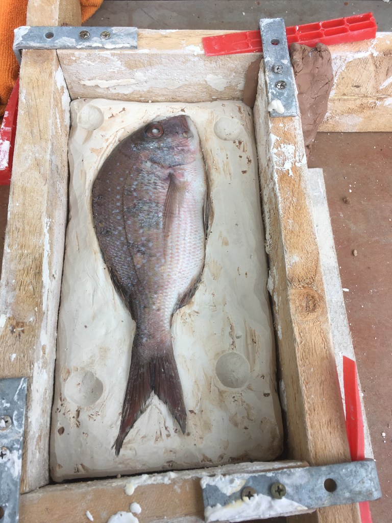 3 kg of fast set plaster sprinkled over 2 kg waster and then gently nudged around and left for 1 min. Poured thinly over kete