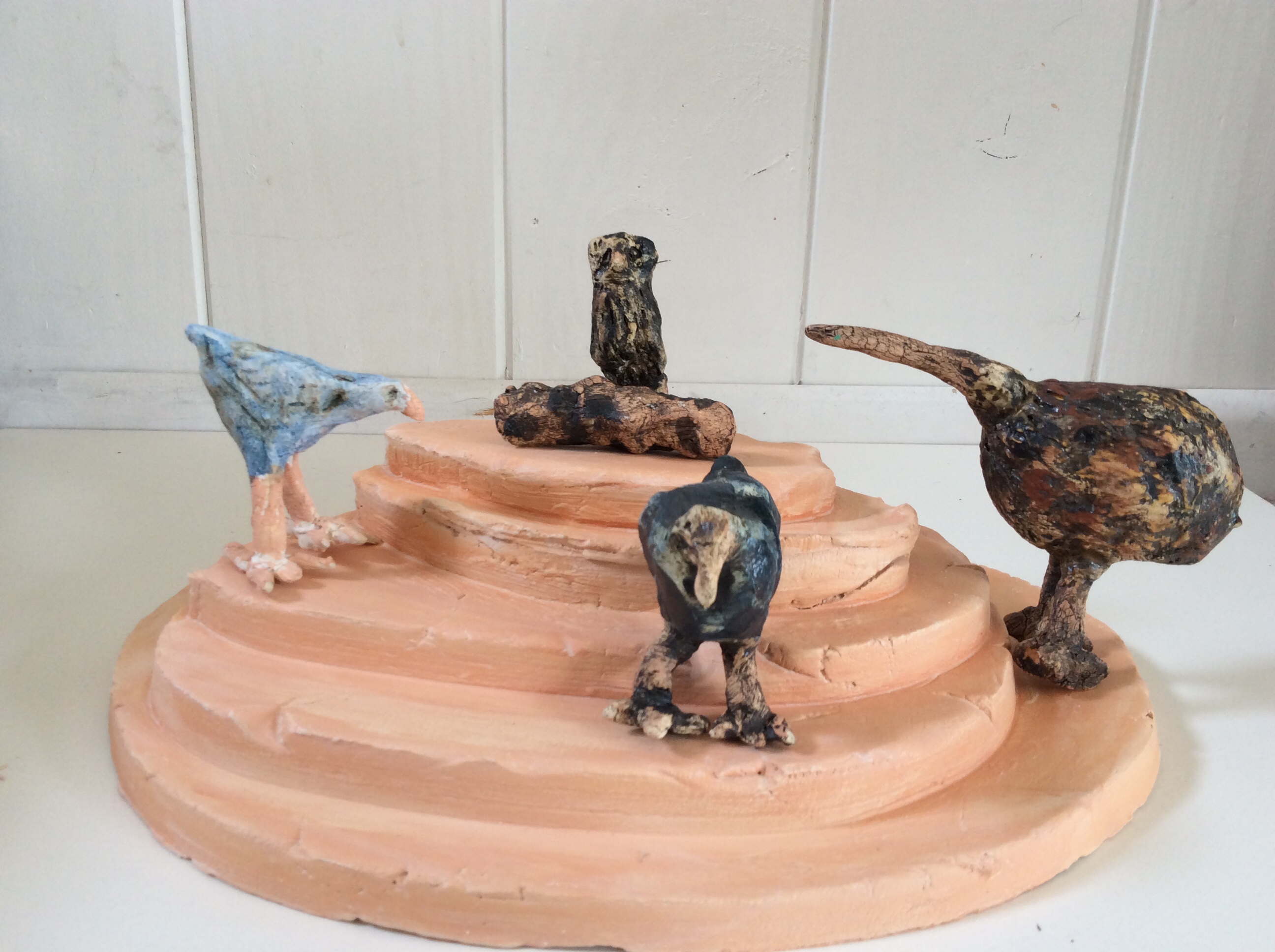 Red terracotta sigillata applied to green ware before bisque fire at 900 degrees centigrade. Coloured slip on top of bronze slip applied to squished native birds.