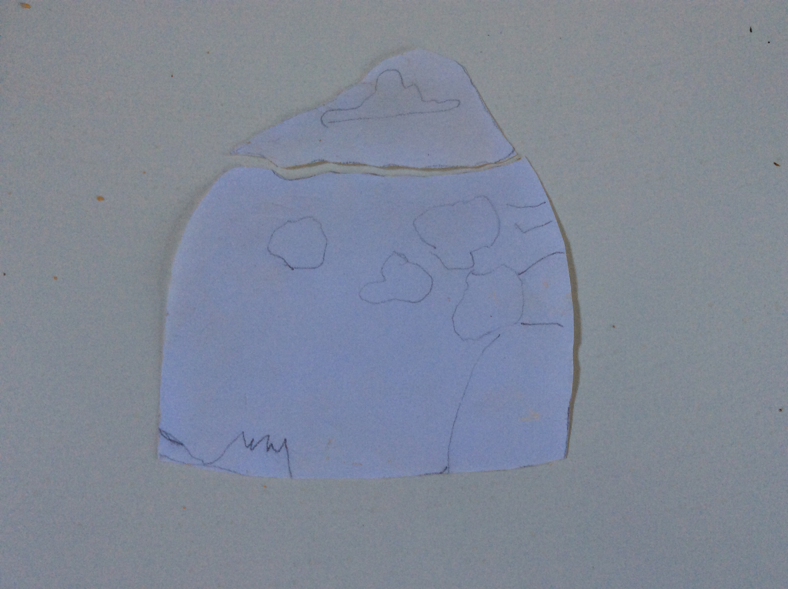 Felt pen applied to midline of kete before placing against a back board and bricks used to support kete. Clay applied up to midline. Soft soap applied on outside of kete with sponge and then wiped back with tissues
